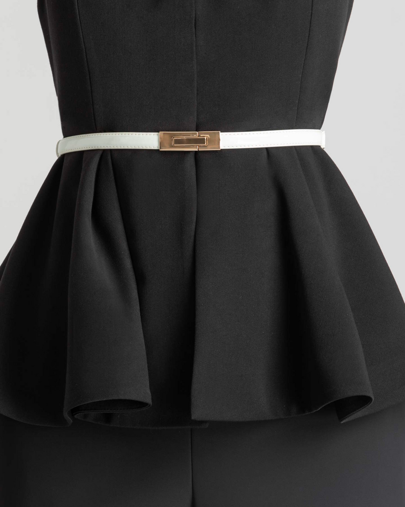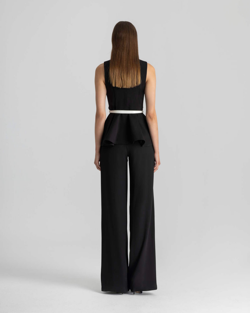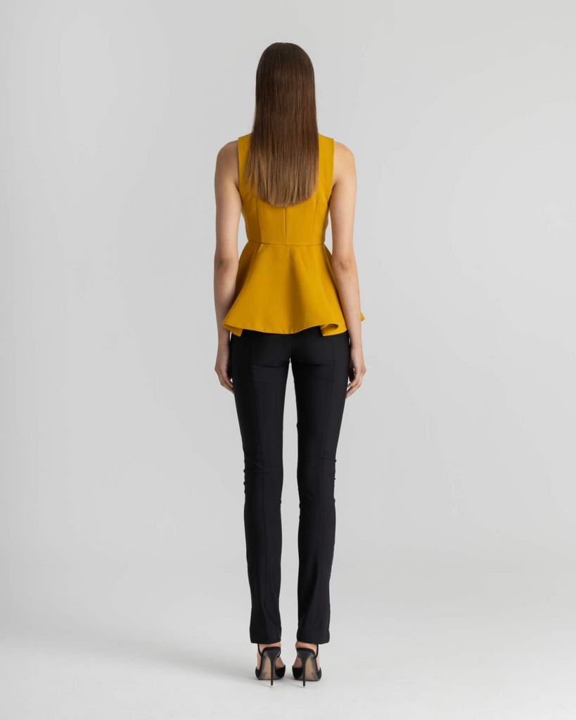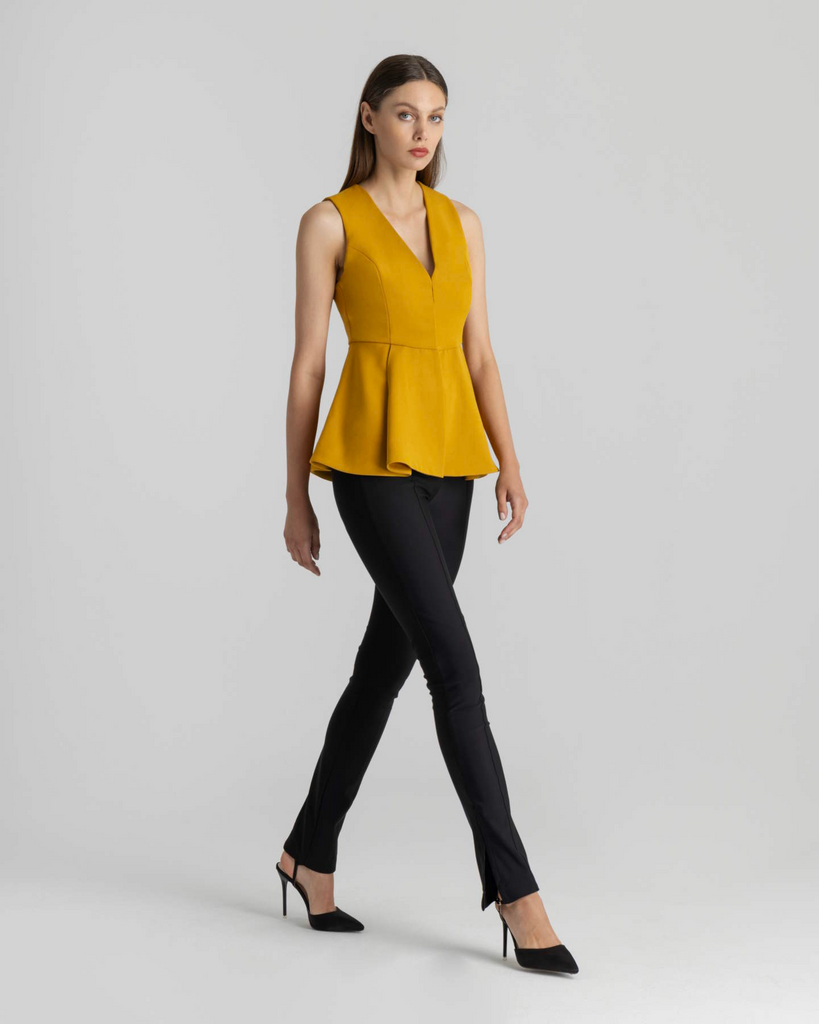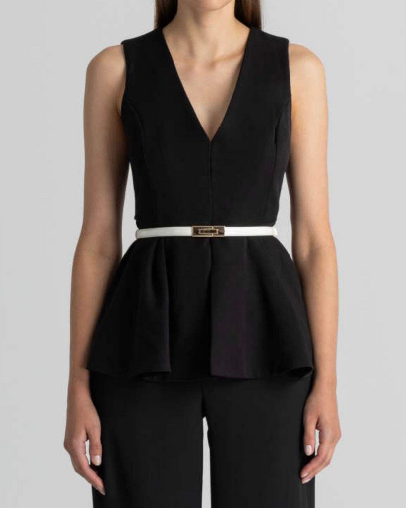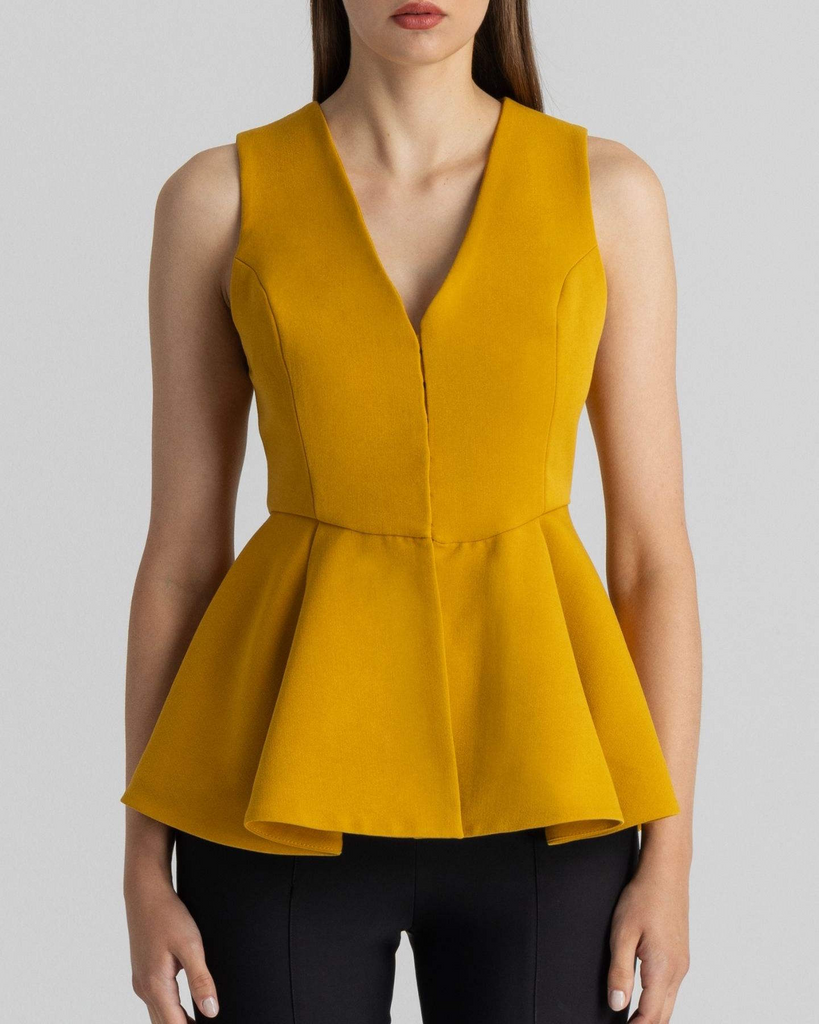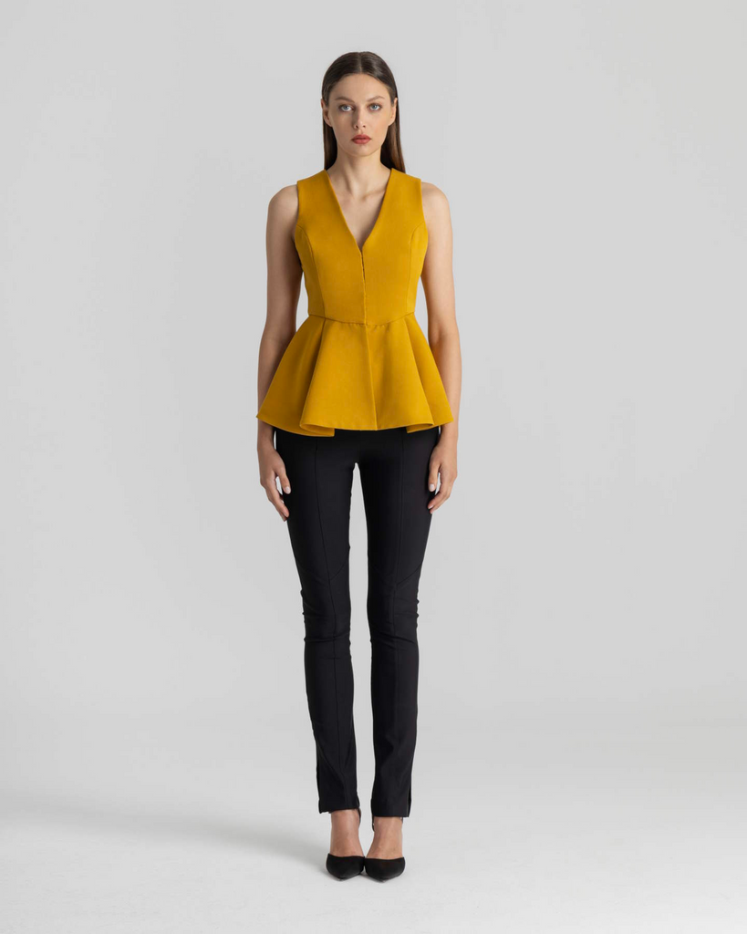 Μία σύγχρονη εκδοχή του γιλέκου, με έντονες ραφές που αγκαλιάζουν το σώμα και ένα αβίαστα κομψό τελείωμα με βολάν. Το βαθύ V στο μπούστο δημιουργεί μια ανάλαφρη αίσθηση, ενώ οι πιέτες προσθέτουν κίνηση και έναν διακριτικό όγκο. Έχει κρυφό κούμπωμα για καθαρό φινίρισμα και σταθερή εφαρμογή. Συνδύασέ το με tailored παντελόνι ή μίντι φούστα για μια κομψή και σύγχρονη επαγγελματική εμφάνιση. Μεταμορφώνεται εύκολα για το βράδυ με ένα τολμηρό αξεσουάρ. Σύνθεση: 15% Ray, 80% Pes, 5% Sp Σχεδιασμένα & Κατασκευασμένα στην Ελλάδα.