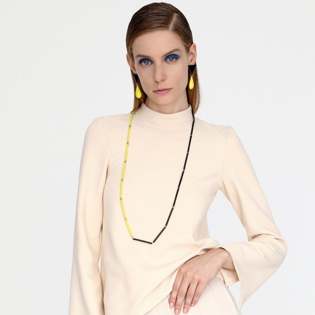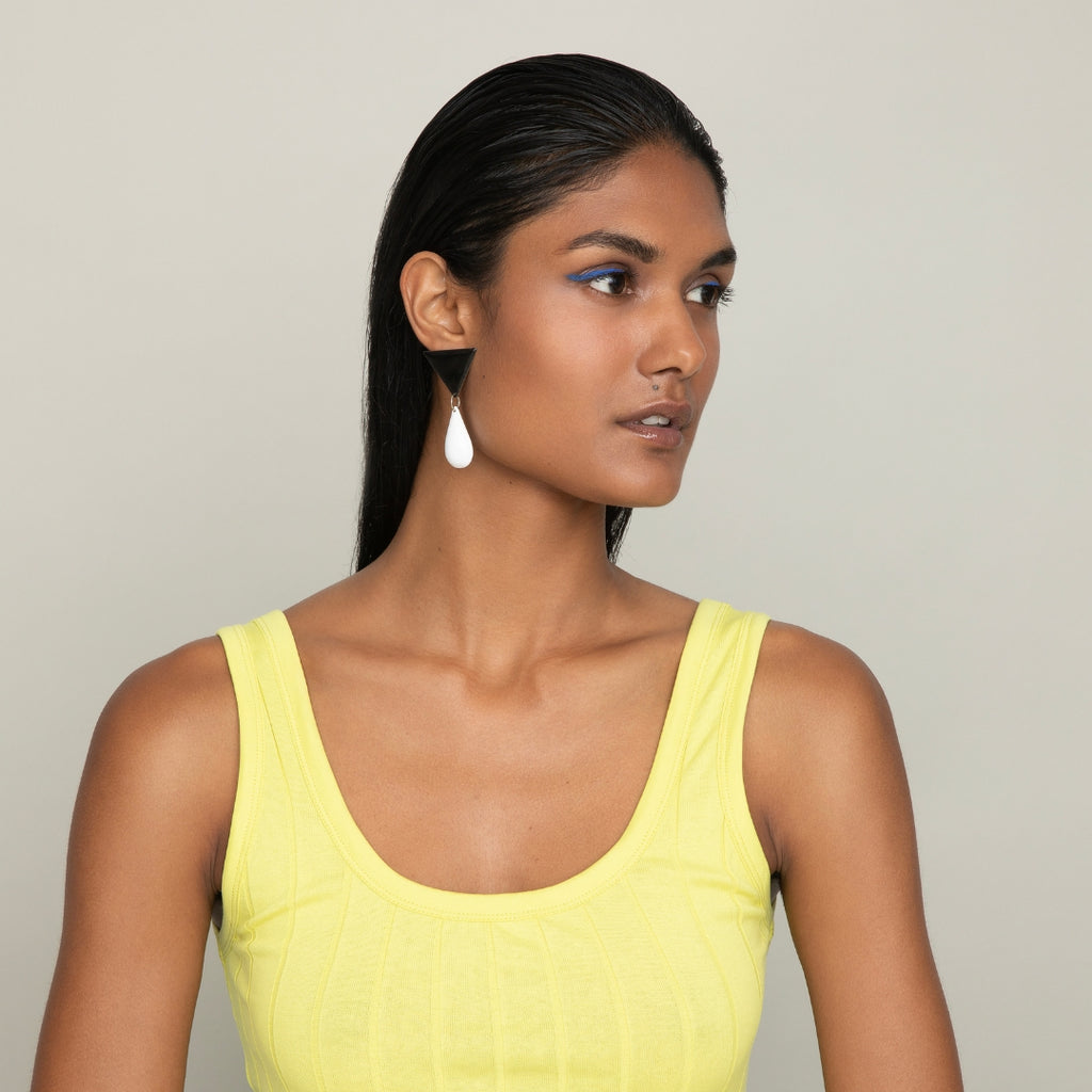 Μοναδική απλότητα σε ένα εντυπωσιακό ζευγάρι σκουλαρίκια αποτελούμενο από έντονα βασικά χρώματα και σχήματα. H απλότητα και η ακρίβεια αντιπροσωπεύουν το βασικό κανόνα του κινήματος του Bauhaus.