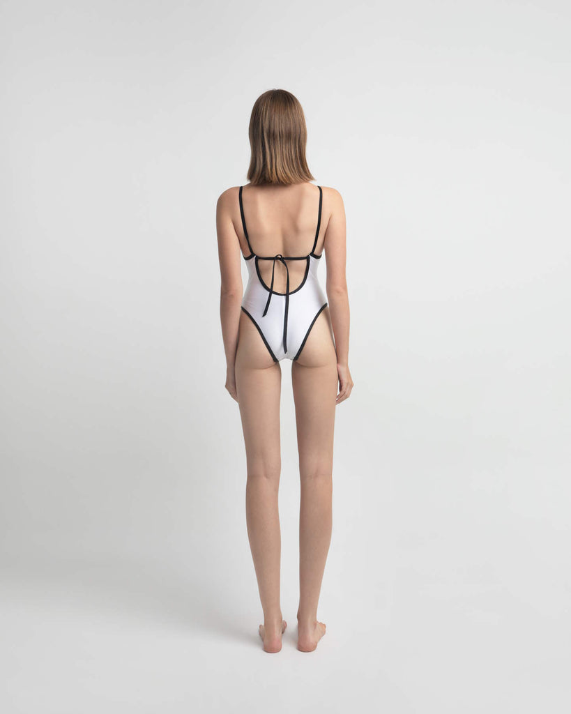 One-piece swimsuit in white color with black detailing, made from a wonderful stretchy fabric. Its modern design promises to elevate your beach look. With thin straps and a triangular shape at the chest, the design leads to a small V-shaped opening below. With an open back and a tie cord for a better fit. A stunning piece from our Beachwear Collection for unforgettable summer looks. Composition: 100% Pl Designed and manufactured in Greece.