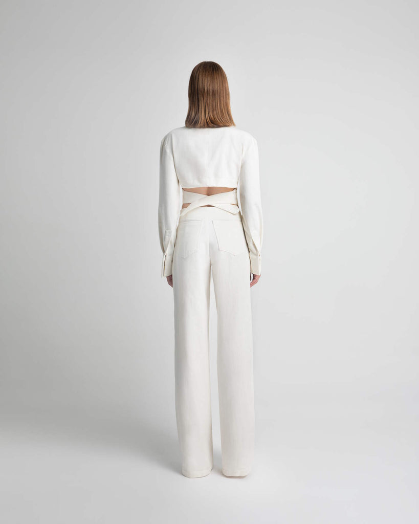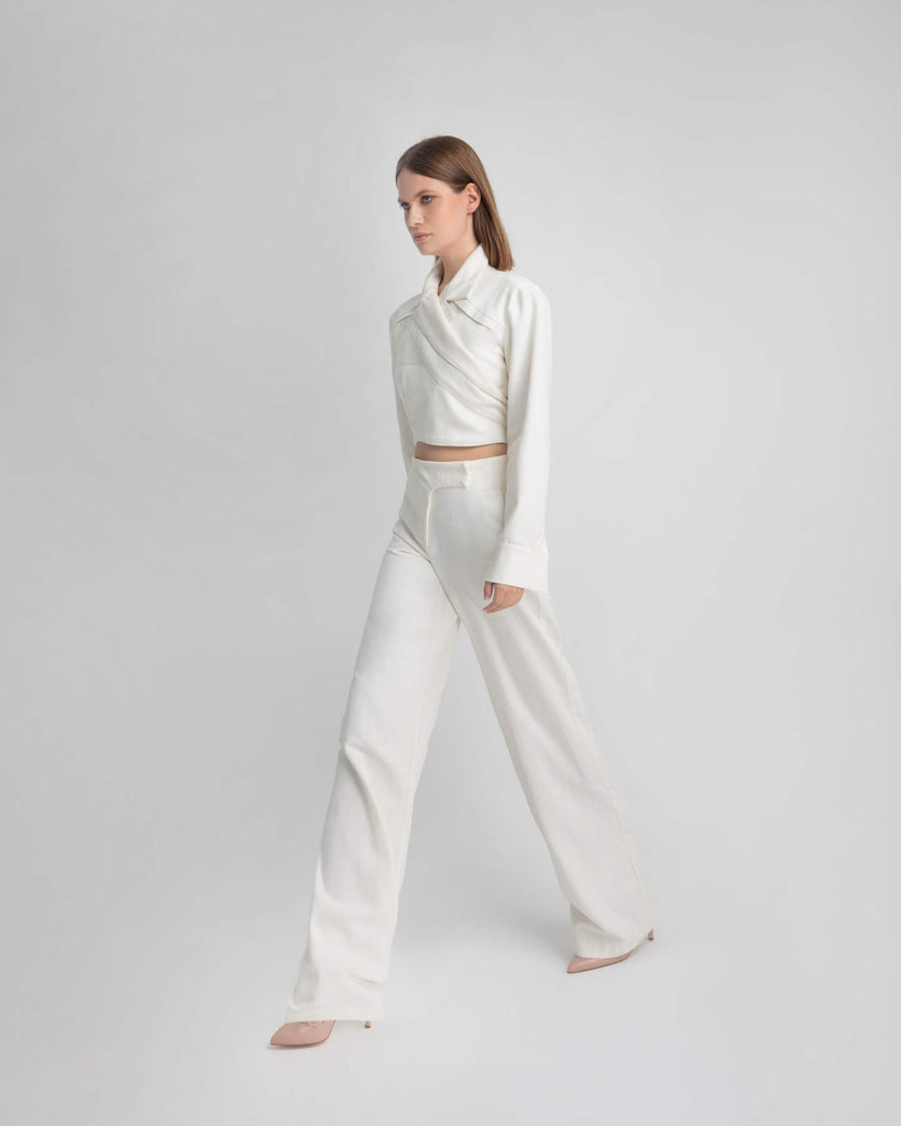 Jeans made from 100% cotton fabric high-waisted with carefully crafted details, such as the zipper design, highlighting its high quality and functionality. The off-white color of the jeans makes them versatile and easy to pair with various styles and outfits. Perfect for casual looks, from morning to evening. Elevate your look with its matching crop jacket. Composition: 100% Cot Designed and manufactured in Greece.