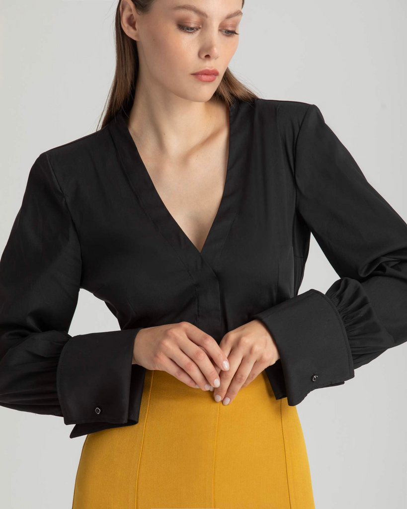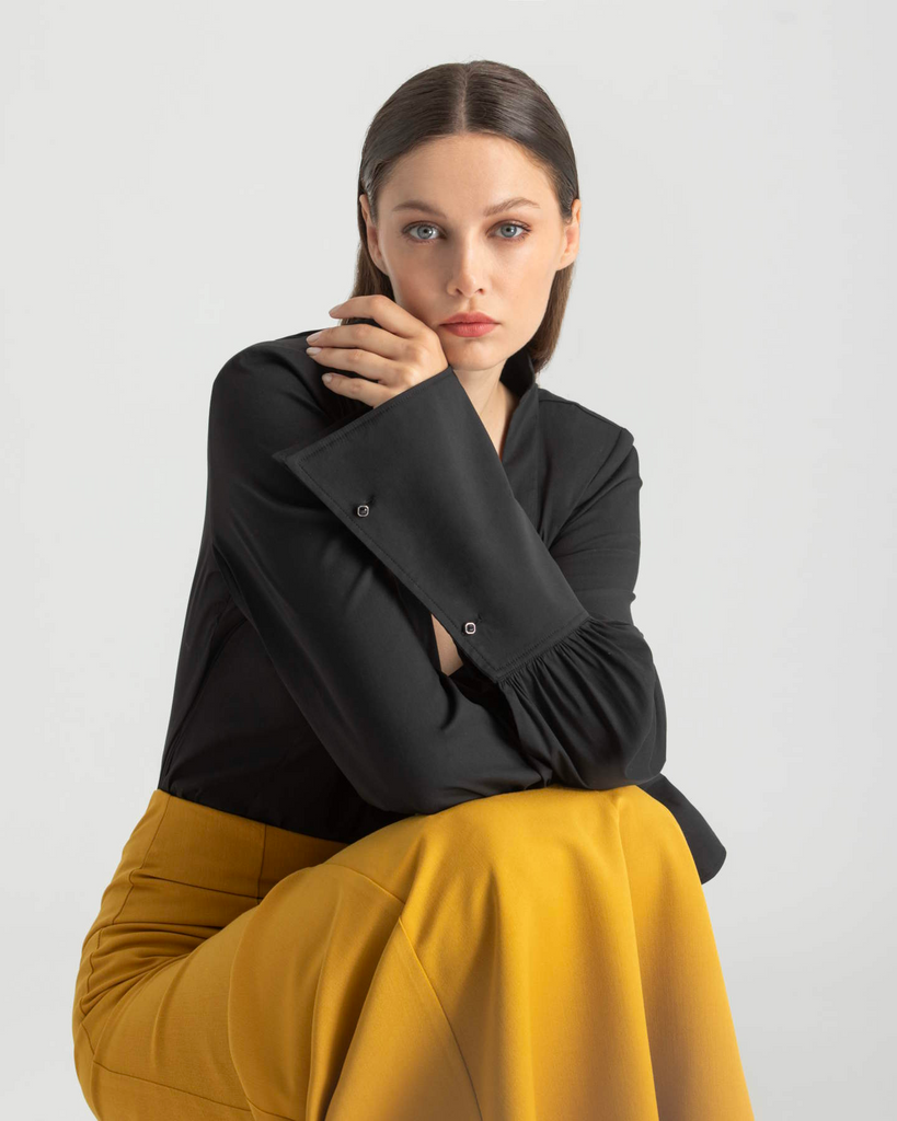 Ανανεώστε τη χειμερινή σας γκαρνταρόμπα με αυτό το εντυπωσιακό πουκάμισο σχεδιασμένο για να προσφέρει χαρακτήρα. Ο υψωμένος γιακάς χαρίζει κομψότητα, ενώ οι σούρες στα μανίκια, οι βάτες στους ώμους και το ντεκολτέ, προσδίδουν δυναμισμό και σύγχρονη θηλυκότητα. Η εφαρμογή του αγκαλιάζει ελαφρώς το σώμα χάρη στο ύφασμα του, προσφέροντας άνεση χωρίς να χάνει τη δομημένη του φόρμα. Το διαχρονικό μαύρο χρώμα το καθιστά ιδανική επιλογή τόσο για καθημερινά chic looks όσο και για πιο statement βραδινές εμφανίσεις. Συνδύασέ το με ψηλόμεσο tailored παντελόνι ή φούστα και ankle boots για ένα σύνολο που αποπνέει σύγχρονη ισορροπία ανάμεσα στην αυστηρότητα και την κομψότητα. Σύνθεση: 61% Cot, 36% Pa, 3% Sp. Σχεδιασμένα & Κατασκευασμένα στην Ελλάδα.