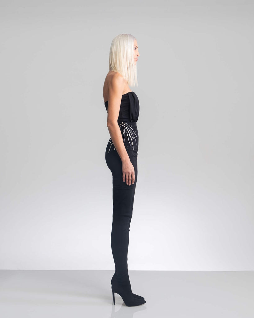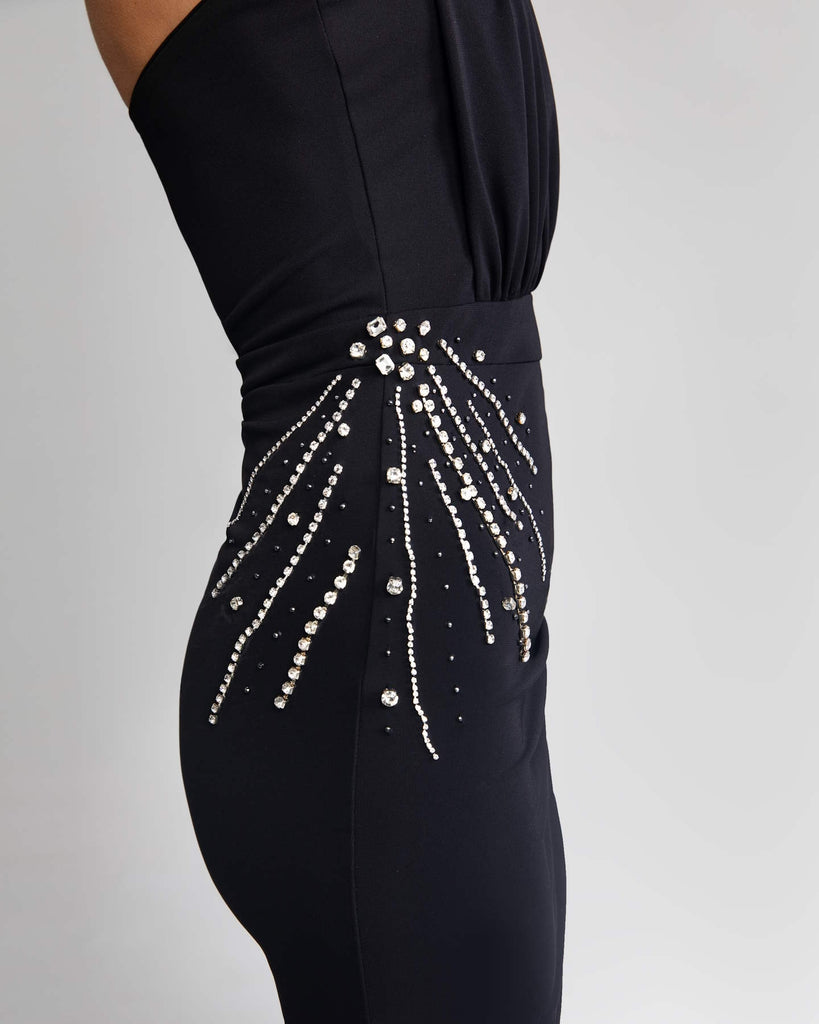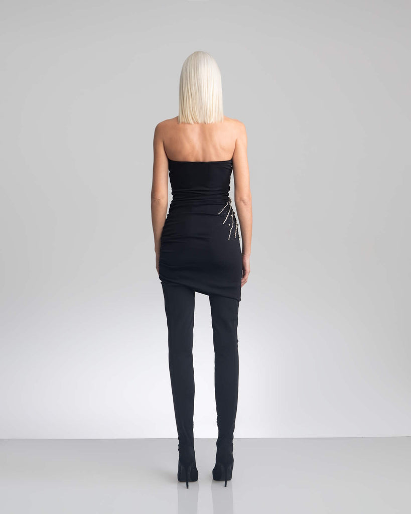 Φόρεμα μαύρο μίνι. Εντυπωσιακό strapless, με σούρες στο στήθος και στους γοφούς που δίνει διάσταση στο ρούχο.