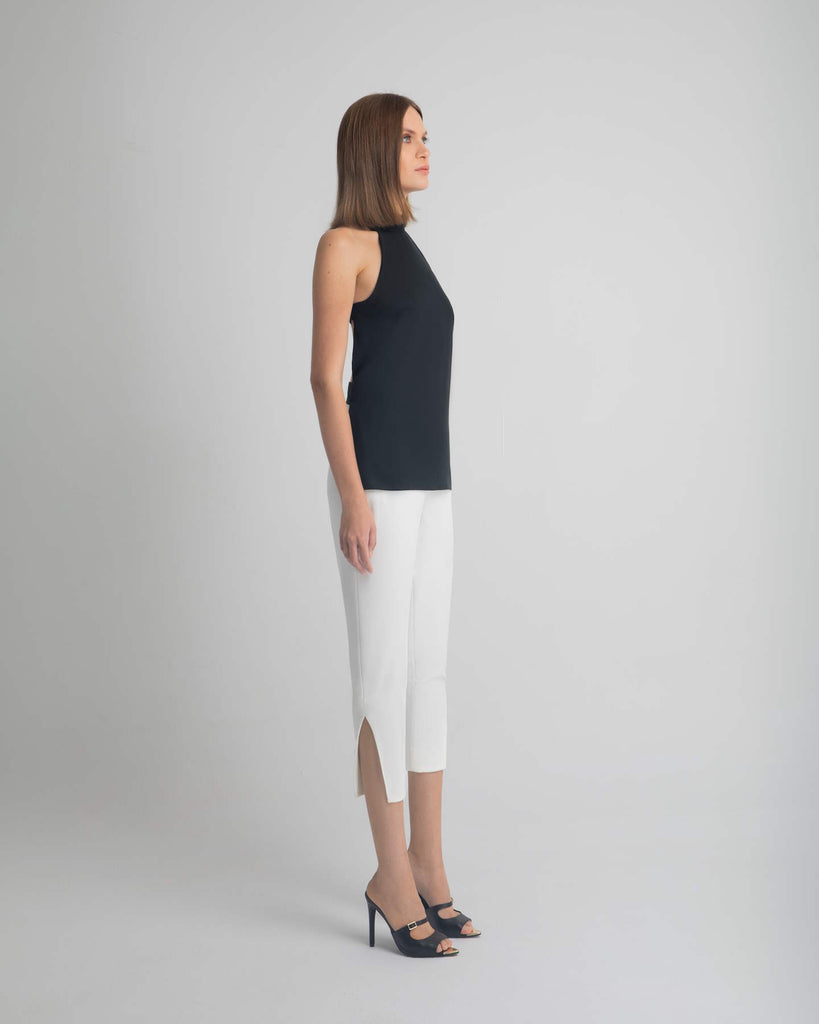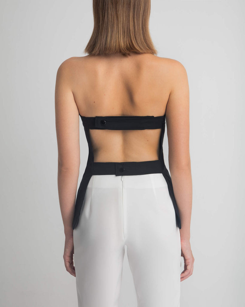 A stylish blouse that combines modern elements with a romantic touch, offering a unique look. It features an open back, highlighting femininity, while the two horizontal panels create an interesting and dynamic line. It has a fastening at the back, providing an elegant finish while offering comfort with every wear. Perfect for evening outings or more formal occasions, this blouse exudes a sense of modern elegance and femininity. Pair it with trousers or even a mini skirt to complete the look. Composition: 40% Visc, 50% Ray, 10% Lin Designed and manufactured in Greece.
