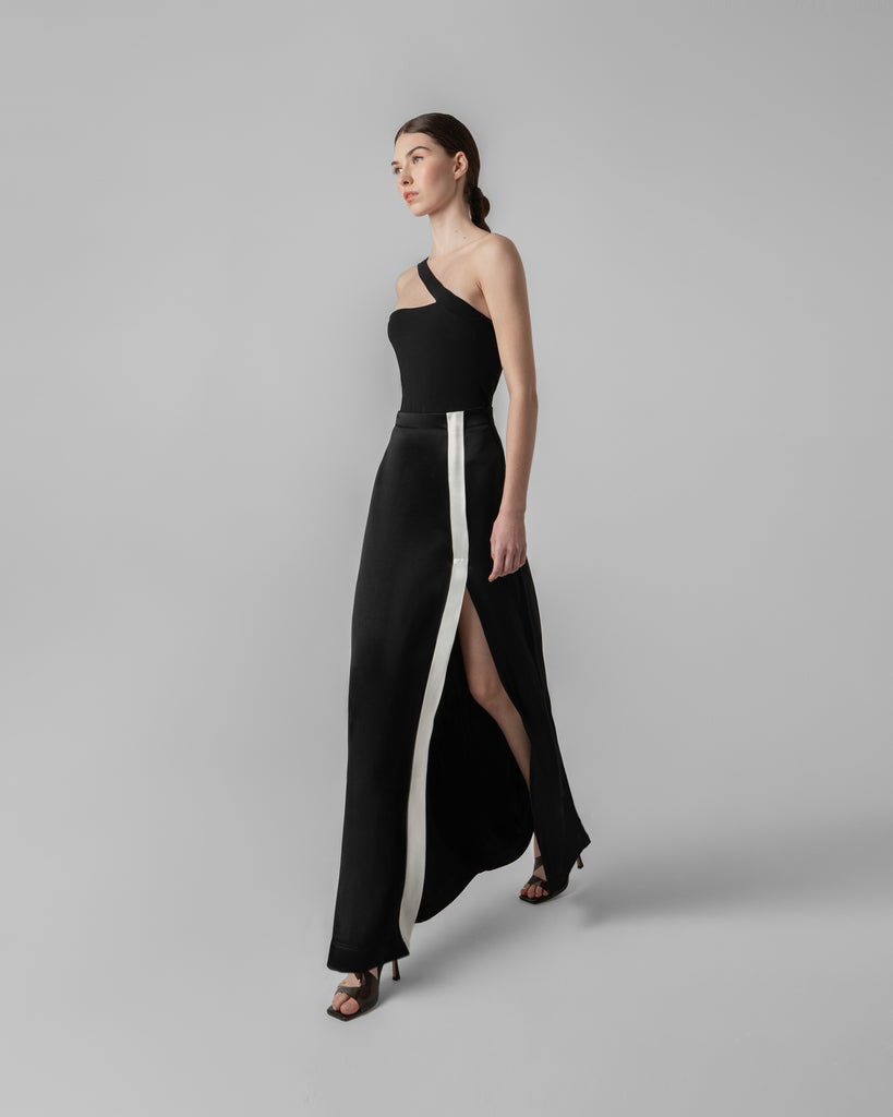 Το body στράπλες με μια λοξή τιράντα αποπνέει κομψότητα και θηλυκότητα..